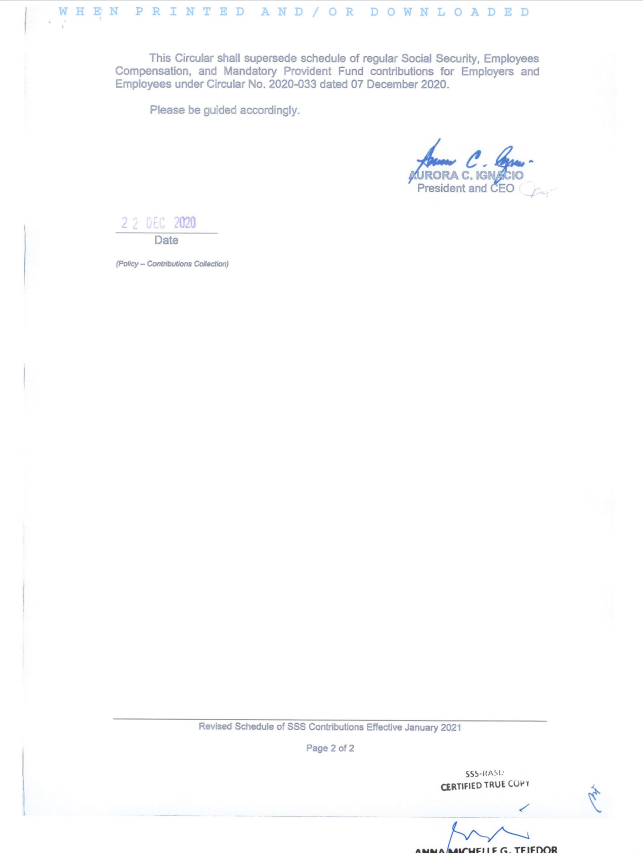 SSS Circular No. 2020-033-b: Revised Schedule of SSS Contributions Effective January 2021